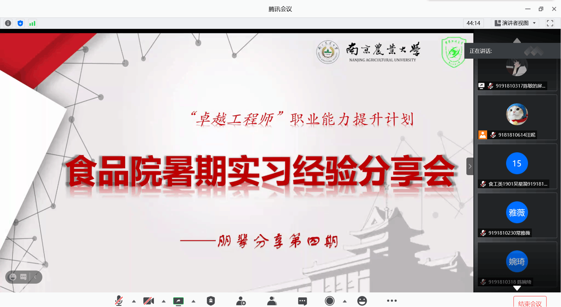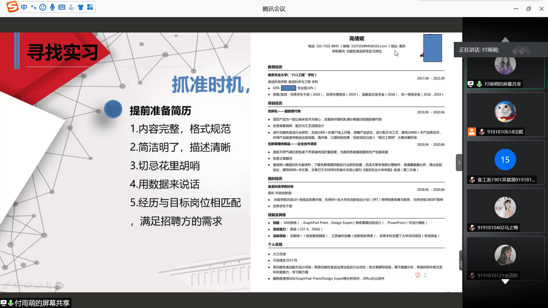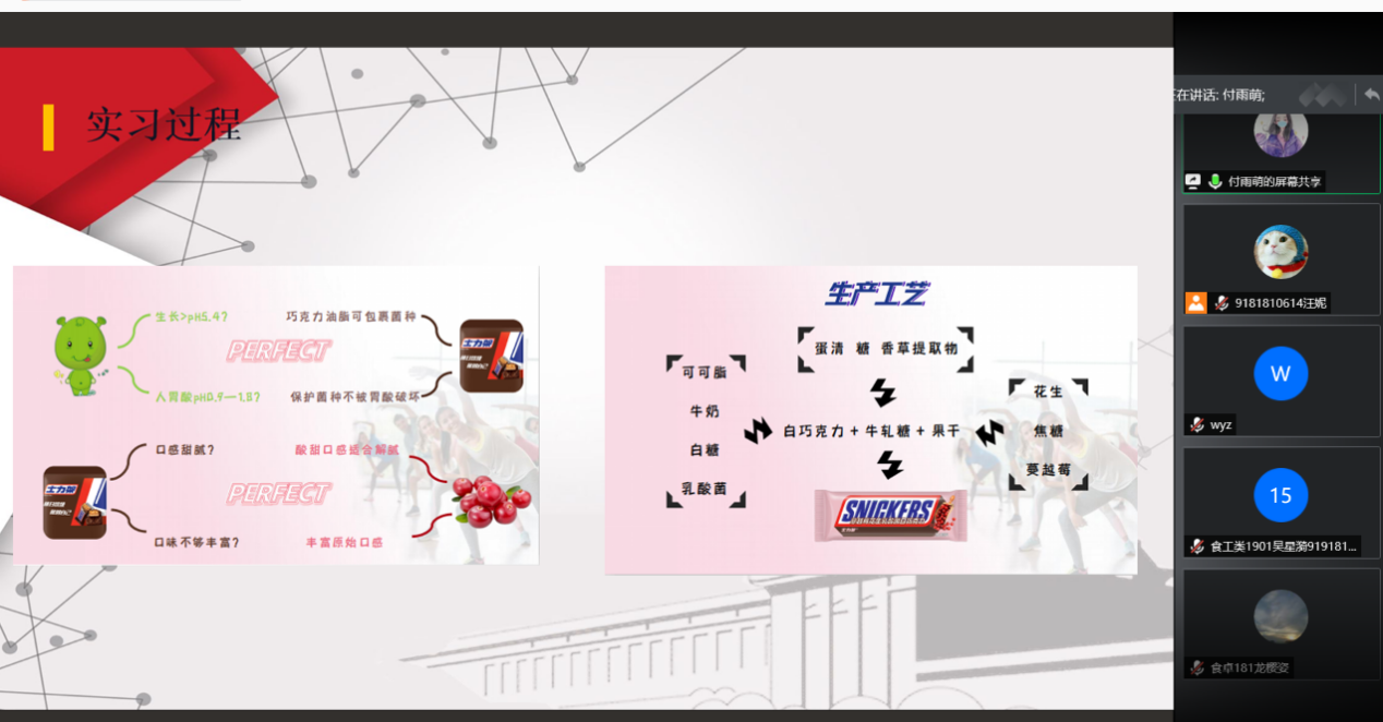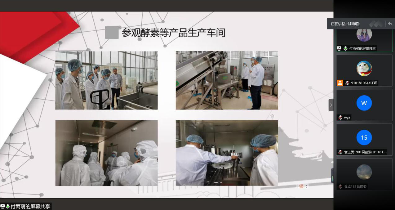 暑期实习分享会通过线上腾讯会议举行。来自食工卓越171班的付雨萌牛晓康、高倩妮三位同学受邀讲述了暑期实习故事,分享了实习心得,为学弟学妹们未来的实习规划提供了宝贵的经验。