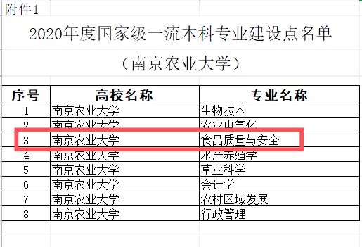 “食品质量与安全”专业入选“2020年度国家级一流本科专业建设点”。