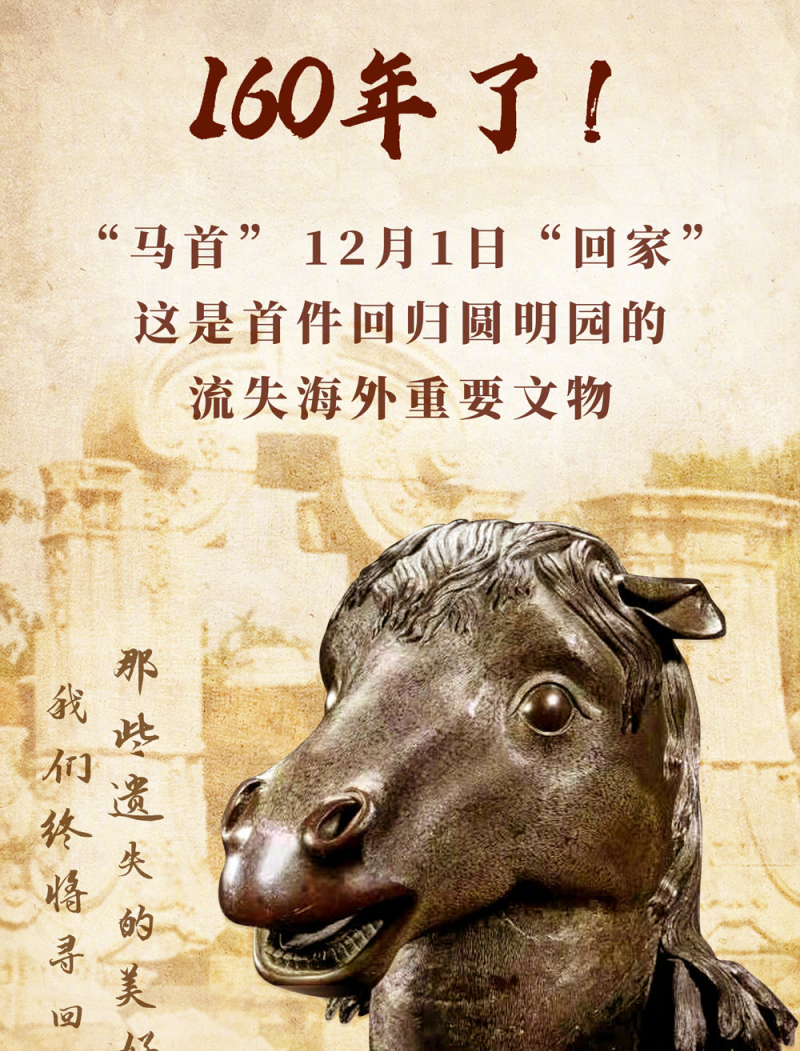 12月1日, 国家文物局、北京市人民政府在圆明园正觉寺举行“圆明园马首铜像划拨入藏仪式”,国家文物局正式将圆明园马首铜像划拨北京市海淀区圆明园管理处收藏,成为第一件回归圆明园的流失海外重要文物。据悉,《百年梦圆——圆明园马首铜像回归展》同时对公众开放。展览以马首回归为主线、分为圆明重光、万园之园、马首回归三个单元,展出文物、照片等共约100组件,它作为正觉寺基本陈列持续展出。