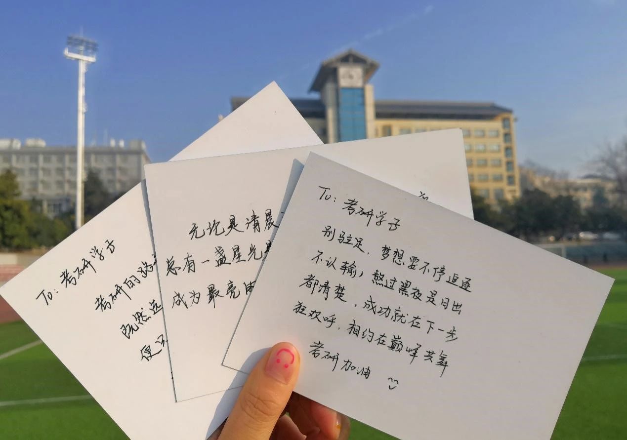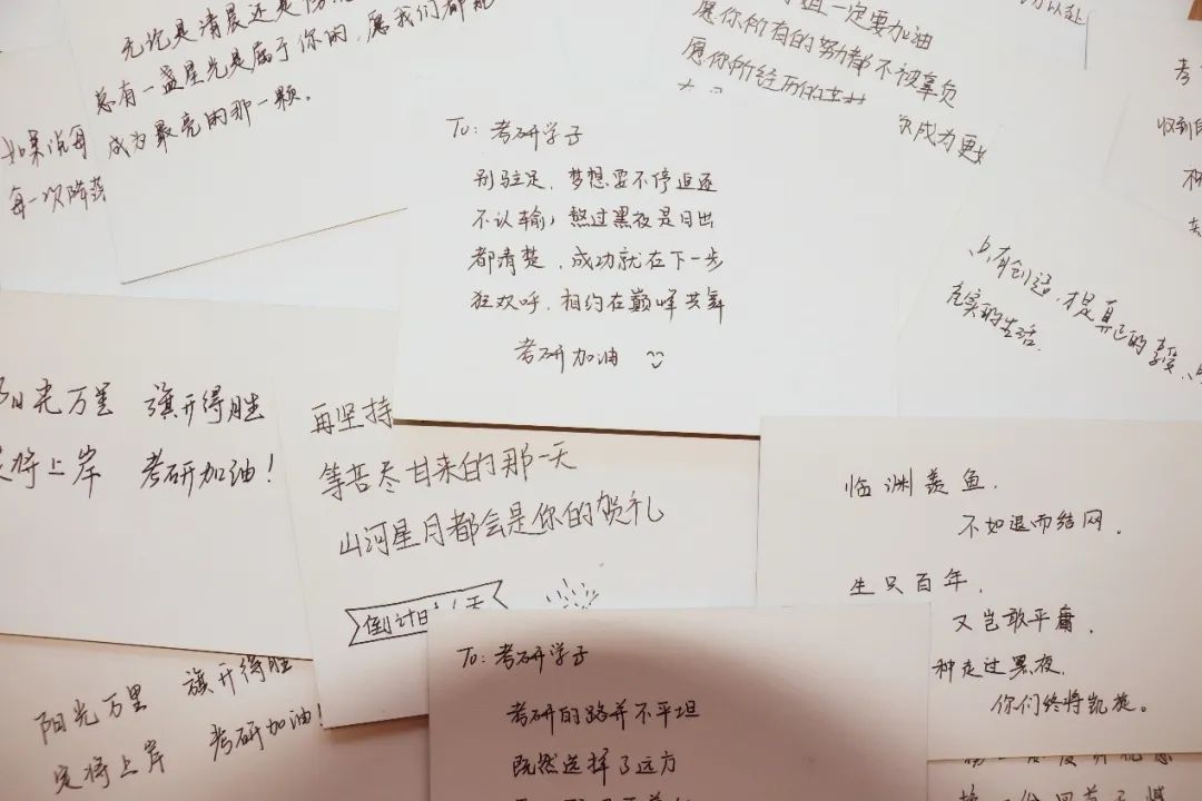 老师和学弟学妹们写下祝福满满的明信片,为考研学子送上祝福。愿同学们旗开得胜,成功上岸。