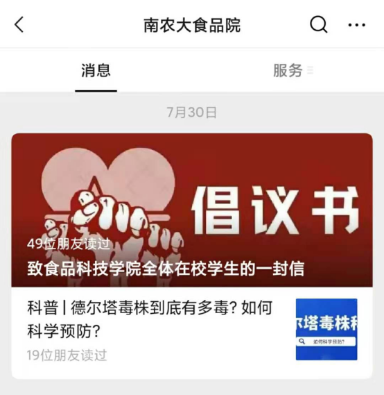通过微信公众号及时发出倡议书,呼吁同学们积极配合防疫工作,并推出抗疫特刊为食品学子科普防疫指南,引导在校学生合理规划时间,及时调整学习、生活计划。