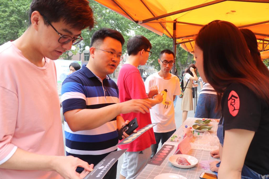 身为食品人,不仅具有良好的理论基础,也有充分的实验能力,以及向公众普及简单的食品检测技巧的责任。在科技体验区,共准备了三个小实验:生肉比色是通过比色卡对照,能够判断肉质的好坏;果蔬检测则是通过检测试纸,便能知晓农药残留情况,从此农药不再“隐形”;最具特色的是最后一个“绛引珠”实验,“绛引珠”是由食品院学子研发并获得专利的一个项目,通过“绛引珠”能够检测油脂成分,最直观的便是能够分辨正常油与地沟油,具有极高的实用价值。