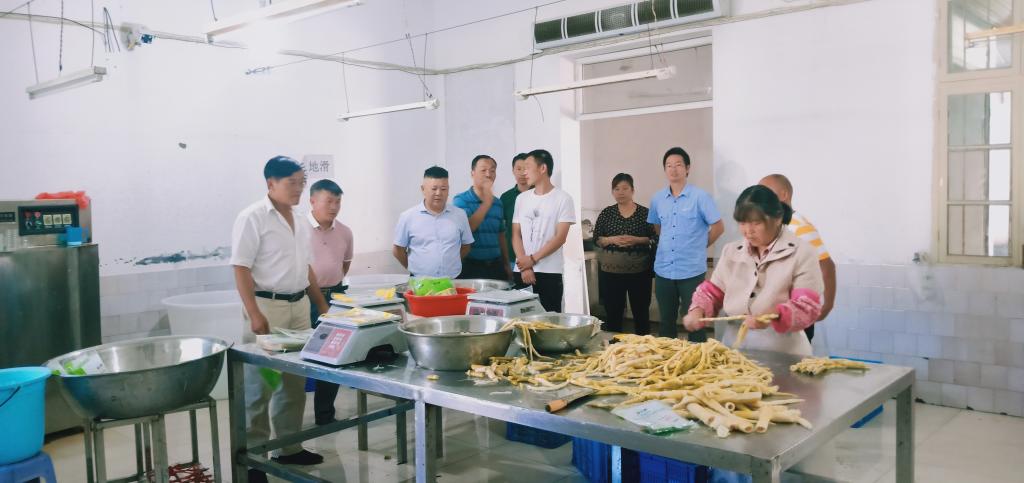 团委书记汪浩,麻江县河山村第一书记、学生工作部(处)民族学生事务管理办公室主任裴海岩的陪同下,麻江县人大常委会副主任王芝莲一行赶赴安徽省旌德县朝辉绿色食品有限公司考察学习蕨菜、竹笋等深加工产业。韩永斌教授就兰山村特有资源蕨菜、竹笋的深加工技术流程作了详细的介绍,并为兰山村度身定制了相关加工技术规程,为兰山村的第一个特色加工产业发展奠定了良好的基础。