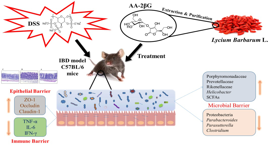 该研究表明红果枸杞中一种抗坏血酸衍生物2-O-β-D-葡萄糖基-L-抗坏血酸(AA-2βG)对葡聚糖硫酸钠(DSS)诱导的结肠炎小鼠有抗炎症活性,并对肠道菌群有一定的调节作用。该研究成果获得了匿名审稿专家的肯定,为AA-2βG的抗炎症活性提供了新的支持,同时为枸杞中活性成分AA-2βG的开发提供了科学理论依据。该研究得到了南京农业大学明星黑料