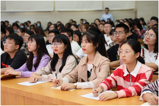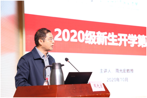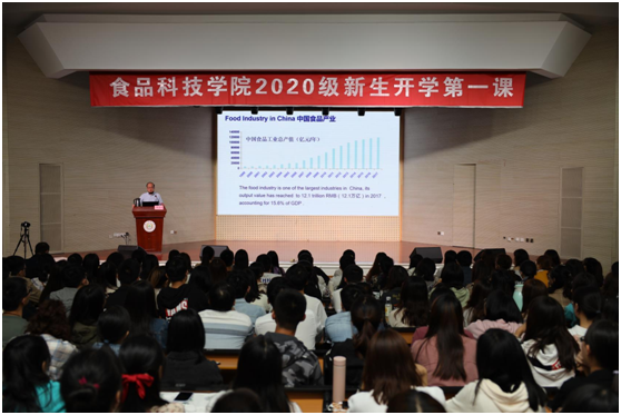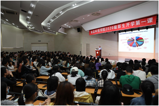 在大学生活动中心举行2020级新生开学第一课,报告由原南京农业大学校长、中国畜产品加工研究会会长、国家肉品质量安全控制工程技术研究中心首席科学家周光宏教授主讲。食品科技学院党委书记孙健、副书记邵士昌、本研辅导员、全体2020级本科新生与研究新生近400人参加了本次报告。报告由孙健主持。