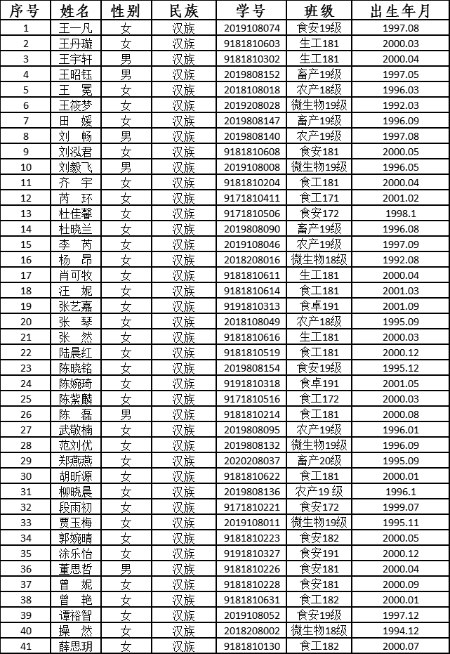 党组织一年以上的线上和线下系列培训教育,以及对发展对象的志愿服务、任职经历、科研水平、学业成绩、创新能力等的综合考察,现拟将王一凡等 41 位同志确定为党员发展对象。现将具体名单公示如下(按姓氏笔画排序):