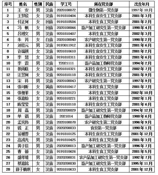 党组织一年以上的线上和线下系列培训教育,以及对发展对象的志愿服务、任职经历、科研水平、学业成绩、创新能力等的综合考察,现拟将王安等 28 位同志确定为党员发展对象。现将具体名单公示如下(按姓氏笔画排序):