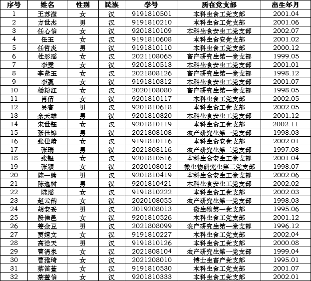 党组织一年以上的线上和线下系列培训教育,以及对发展对象的志愿服务、任职经历、科研水平、学业成绩、创新能力等的综合考察,现拟将王苏滢等 32 位同志确定为党员发展对象。现将具体名单公示如下(按姓氏笔画排序):