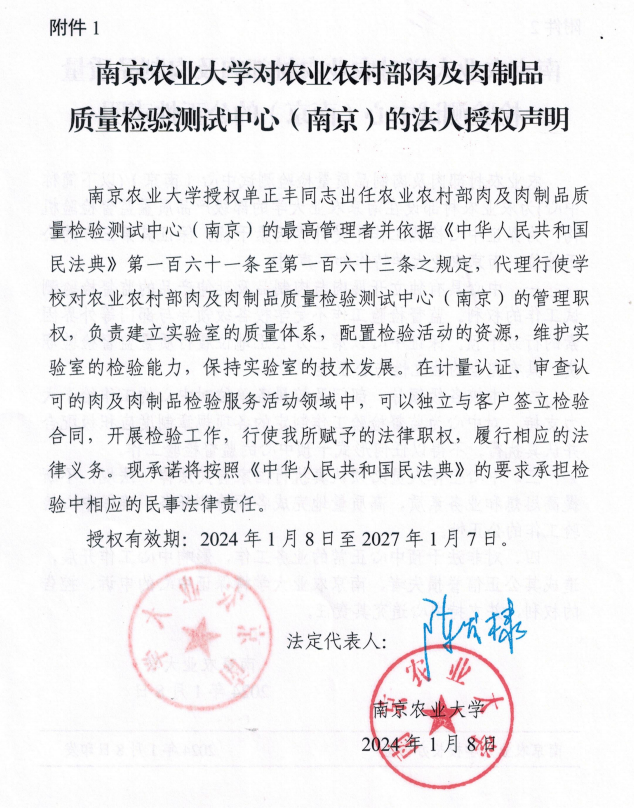 农业农村部肉及肉制品质量检验测试中心(南京)(以下简称“中心”)是农业农村部部级产品质量检验测试中心,中心根据农业农村部(农质发〔2013〕1号)文组建。中心于2015年3月通过国家认监委农业组的国家计量认证、食品检验机构和农业部检验机构考核、审查认可的首次评审,获得资质认定计量认证证书、食品检验机构资质认定证书、农产品质量安全检测机构考核合格证书、农业农村部审查认可证书。中心主管部门是南京农业大学,由南京农业大学法人授权独立对外开展检验业务,中心有相对独立账目,独立核算,为具有第三方公正性的肉及肉制品质量检验机构,是社会公益性技术服务事业单位。
