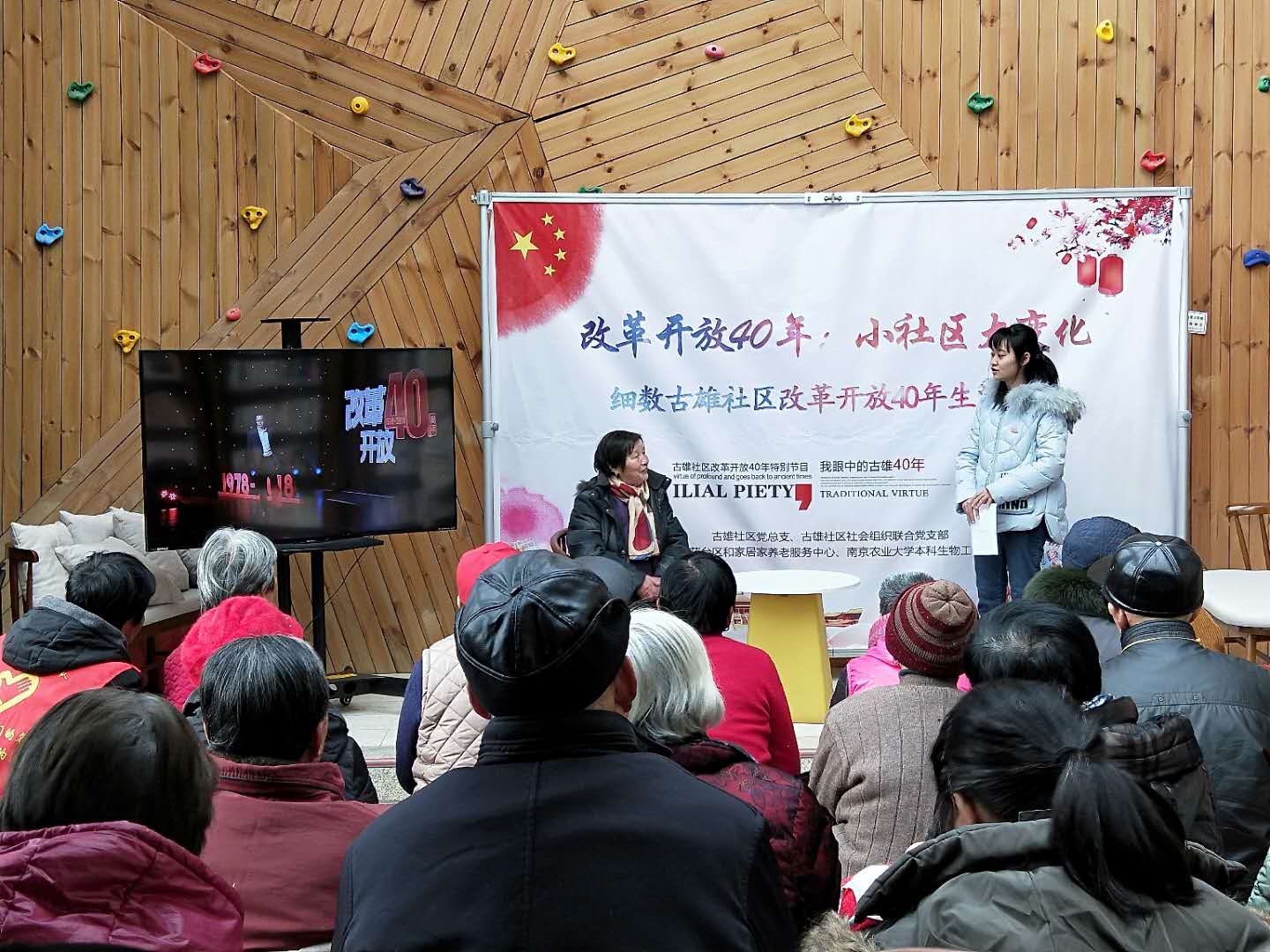 2018年是中国改革开放40周年,为深入学习贯彻落实党的习近平新时代中国特色社会主义思想和党的十九大精神,激励生工党支部全体党员牢记使命担当,感受风雨四十年奋进的中国路,立足新时代,树立远大理想信念,展当代学生党员新风貌。本科生工党支部联合古雄社区党总支、古雄社区社会组织联合党支部与南京市雨花台区和家家居养老服务中心,开展纪念改革开放40周年主题党日活动。