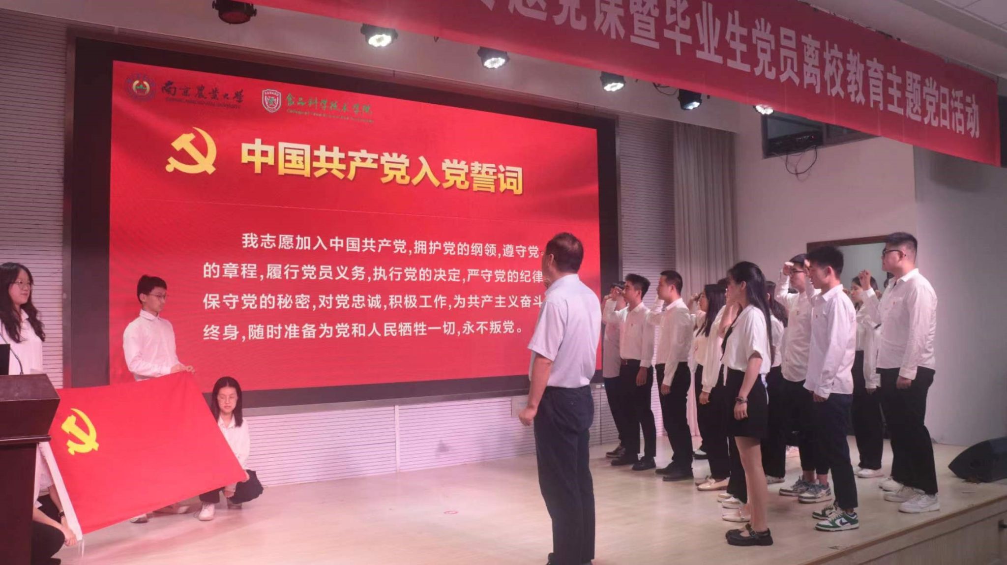 狄传华在主持讲话中强调,全体师生党员要以此次党日活动为契机,进一步提高站位,深入开展《条例》的学习,在学习贯彻《条例》上下功夫见真章出实效。全体师生党员、特别是毕业生党员始终牢记初心使命,立足本职岗位,发挥党员先锋模范作用,以实干笃定前行,以奋斗开创未来,赓续党的光荣传统和优良作风,为建设农业特色世界一流大学贡献食品力量。