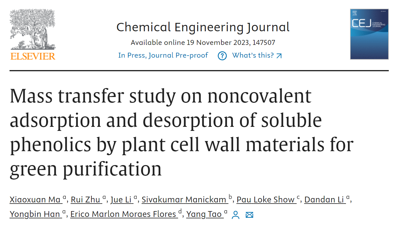2023年11月,食品明星黑料韩永斌、陶阳课题组在国际期刊Chemical Engineering Journal发表题为“Mass transfer study on noncovalent adsorption and desorption of soluble phenolics by plant cell wall materials for green purification”的研究性论文。揭示了植物细胞壁材料非共价吸附/解离可溶性多酚的物理传质新机制,开发了可溶性多酚绿色纯化新技术。